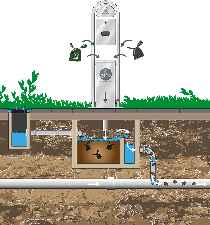 Het water loopt hieruit en de hondenpoep wordt verder verwerkt met behulp van bacteriën.